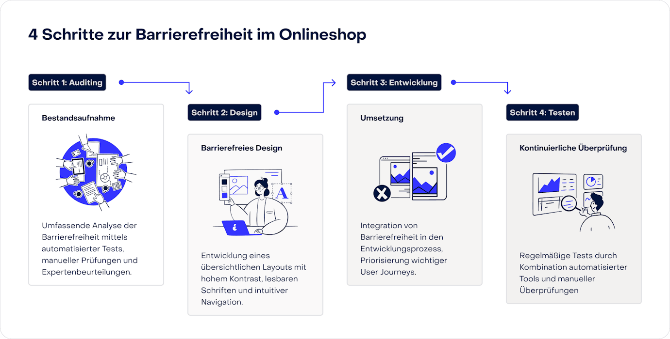 Um sicherzustellen, dass Ihr Onlineshop barrierefrei und für alle Nutzer:innen zugänglich ist, sind gezielte Maßnahmen erforderlich. Google und die Aktion Mensch empfehlen Unternehmen, diese 4 Schritte zu befolgen, um ihr digitales Angebot inklusiver zu gestalten: